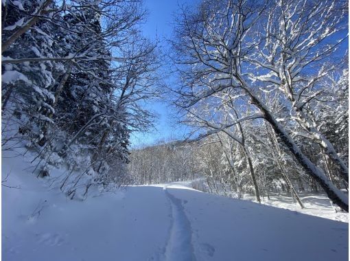 人気のスノーシュートレッキングツアーです。雪の林の中をザクザク進み、登ったり駆け降りたり雪を楽しむツアーです。