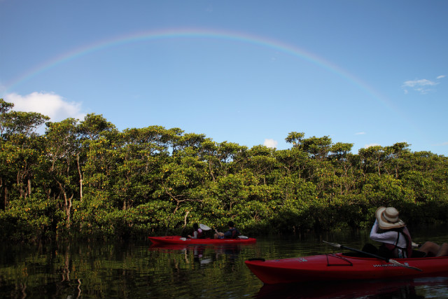 マングローブ林の中にカヌーでこぎ入り、のんびりと観察しながら林の奥へ。所要時間約2時間のマングローブカヌープランです。12時すぎにツアーは終了となるので午後からレンタカーなどを利用し観光もできます。