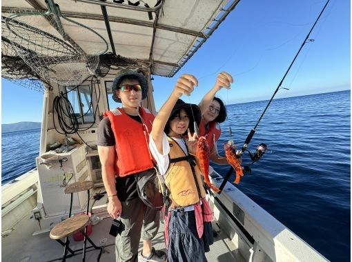 乗合船に乗って、五目釣りを楽しむプランです。無料で竿リールビシセットも付いてくるので、手ぶらで気軽にご参加いただけます。ライトタックル(軽めの釣竿)を使うこともできるので、初心者も安心ですよ。釣りは思ったよりも簡単、「はじめてでも楽しめた」と言うお声を多数いただいております。イナダ・カンパチ・アマダイ・タイ・アジ・サバなどたくさんの種類のお魚が釣ってお持ち帰りいただけます!