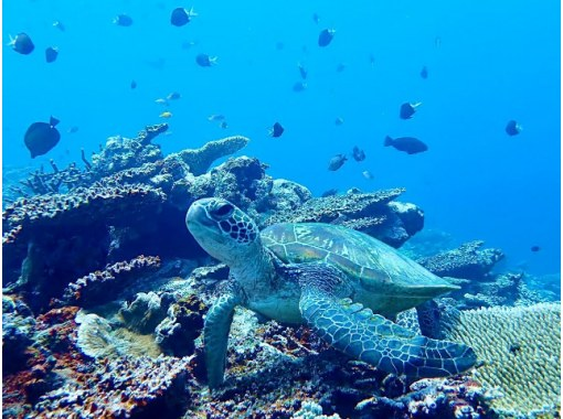 水底までキレイに見える透明度の高いケラマの海でのダイビングではたくさんのカラフルな魚が覗けるのはもちろん、時にはカメにも遭遇することも。予定のポイントは、座間味島・黒島・渡嘉敷島・儀志布島・前島いずれか2ポイント。午前中にたっぷり体験ダイビングを楽しんだあとは、ボートでのんびりランチタイムを楽しみ、午後からは、ポイント移動もするので、そのままスノーケル(無料)を楽しむのも良し!
