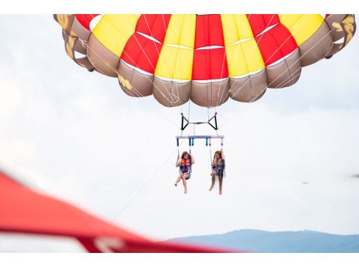 カラフルなパラシュートを背に、ボートに引かれグングンと上昇し、空を泳ぎましょう。
