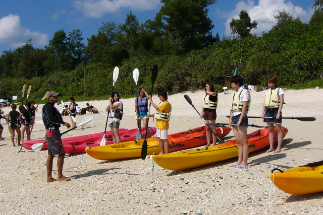まずは真っ白な砂が目にまぶしい天然のビーチでカヤックを体験。