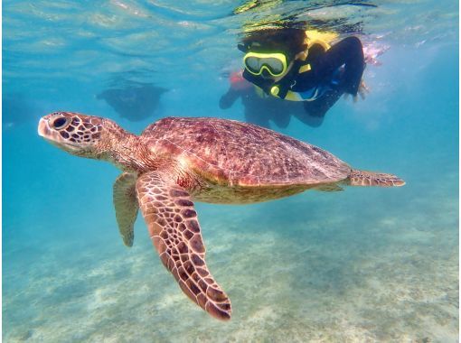 慶良間諸島は透明度抜群の海とカラフルなサンゴや魚がいっぱいいるだけでなく、ウミガメに出会えることでも人気の場所です!シュノーケリング中にウミガメが水面に来てくれれば一緒に写真も撮れますよ♪