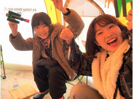 テントや釣り道具はこちらで全てご用意。全面凍結した冬のかなやま湖でワカサギ釣りを楽しもう!