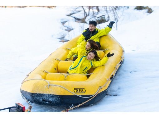 スノーラフティングはゴムボートに乗り、スノーモービルでグイングイン引っ張られて滑走する遊びです。広大な敷地内の迫力満点のコースを風を切りながらスリル満点の走りをお楽しみいただけます。