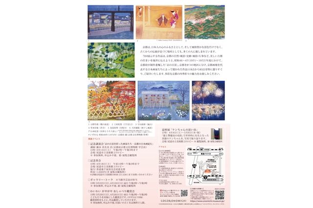 春季特別展「京の百景―描かれた京都の四季」,【観覧料】一般/1000円、学生/600円 (消費税込)※中学生以下無料 ※学生料金でご利用の方は、学生証の携帯をお願いします。 ※70歳以上の方は、証明できるものを提示により無料 。 ※ほか、障害者手帳をお持ちの方など、観覧料の減免対象になる場合があります。詳しくは当館公式ホームページ「ご利用案内」などでご確認ください。,令和8年(2026)3月7日(土) ~ 5月6日(水・祝),京都は、日本人の心のふるさととして、そして風情豊かな景色だけでなく、古くからの伝統が息づく場所としても、多くの人に親しまれています。 今回展示する作品は、京都の自然・風景・史跡・風俗・行事など、美しい古都の佇まいを後世に伝えようと、昭和46~47(1971~1972)年度にかけて、京都府が制作委嘱した「京の百景」。京都を8つの地区に分け、京都画壇を代表する日本画家たちによって描かれた作品118点から83点を特に選りすぐり、ご紹介いたします。多彩な京都の四季折々の魅力をお楽しみください。 .....もっと見る.....閉じる