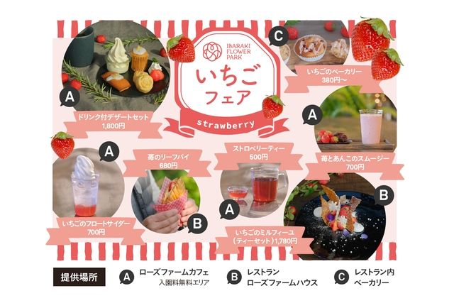 日にち限定!フラワーパークに隣接したいちご温室のハウスで完熟の「やよい姫」摘み取り体験,フラワーパーク第2駐車場に隣接した苺農家さんで、完熟の「やよい姫」1パック(10粒)を摘み取ってお持ち帰りできる開催日限定の摘み取り体験付き入園券です。 フラワーパークの1日入園券付きで、園内で開催中のいちごフェアと合わせてお楽しみください。 【体験の流れ】 ●苺摘み取り体験は、11時にいばらきフラワーパーク第2駐車場に隣接する「さくらのファーム直売所」に集合ください。 ●直売所からスタッフがハウスまでご案内します。 ●ハウスで、お持ち帰り用のパックに10粒摘み取ります。 ※梱包箱の購入希望者は「さくらのファーム直売所」で販売します。 ●いばらきフラワーパークは9時~15時30分(3月は16時30分)までご入園いただけます。(当日中のみ再入園可) 園内ではいちごフェアに加えて、桜や梅、春待つ温室などの花々もお楽しみください。,【同時】旬の苺を贅沢に味わういちごフェア開催中,園内のカフェやレストランでは、地元の農家さんが作った真っ赤ないちごを使ったさまざまなメニューを販売。ドリンクメニューやスイーツ、ベーカリーなど、甘い香りに癒される、この時期だけの特別な旬の味覚を味わって。 .....もっと見る.....閉じる