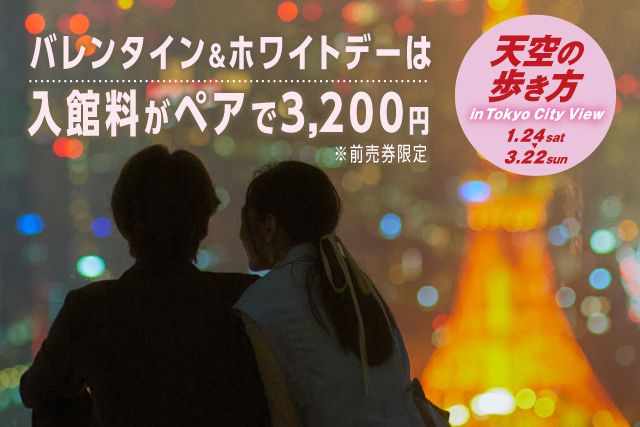 恋人たちの天空散歩「バレンタイン&ホワイトデー」,「天空の歩き方 in 東京シティビュー」 恋人たちの天空散歩「バレンタイン&ホワイトデー」 東京の夜景を一望できる「天空の回廊」が、恋人たちのロマンチックなデートスポットに。 ,六本木ヒルズ展望台 東京シティビュー「都市という名のアート」,東京シティビューは、世界最大級の都市・東京の中心に位置する、海抜250メートルの屋内展望台。 天高11メートルを超える吹き抜けで開放感にあふれ、周囲に視野を遮る建物がないため「都市という名のアート」を存分にご鑑賞いただけます。 最大の特徴は、東京の主要なランドマークを一望できる大パノラマの景色。 東京タワー、東京スカイツリー、新宿のビル群、国立競技場、富士山など主要な建物から景色までをパノラマで楽しめるのは、東京シティビューならでは。 これらのランドマークの夜景を一度に楽しめるのも東京シティビューの特徴です。 日々変化を続ける東京の姿は、訪れるたびに新しい発見を与えてくれます。 .....もっと見る.....閉じる