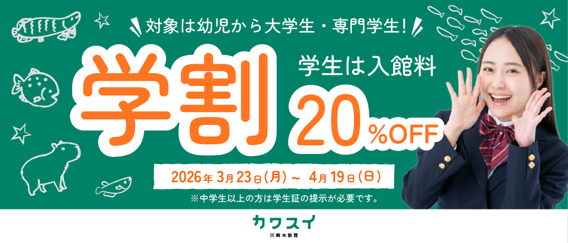 春の学割キャンペーン開催!学生&幼児もお得に楽しもう,春休み&新学期シーズン到来!学生やお子さま向けに特別な割引をご用意しました。 期間中、学生証(中学生以上の方)または年齢確認ができるもの(大学・専門学生は不可)をご提示いただくと、入館料が20%OFF! お友達やご家族と一緒に、お得に楽しめるこの機会をお見逃しなく!,水族館とも、動物園ともちょっと違う。 世界中の生きものが集う 「水辺のオア .....もっと見る