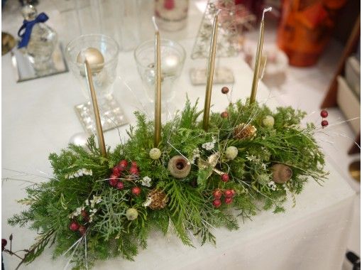 フレッシュグリーンを使用したクリスマスのアドベントキャンドルアレンジを作る体験です。