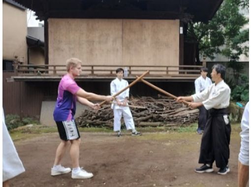 ②同建物の2階では岩間流合氣道教室のお稽古を実施、時間が合えば合わせて見学・体験も可能です。体術だけでなく武器技(剣・杖・短剣使用)もあり。
