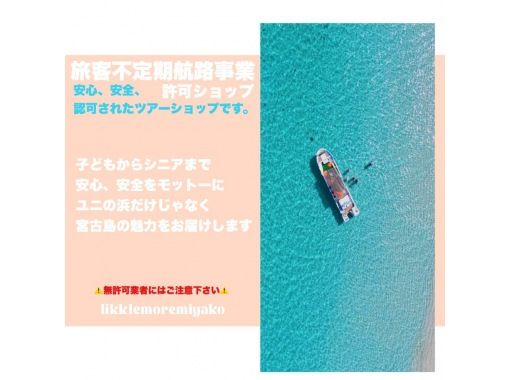 1家族での貸切船として相談可能◇SNS映え間違いなしのユニの浜で家族の思い出作ろう◇宮古島に来たら絶対に行ってほしい、あの宮古ブルーが忘れられない等の反響多数!!