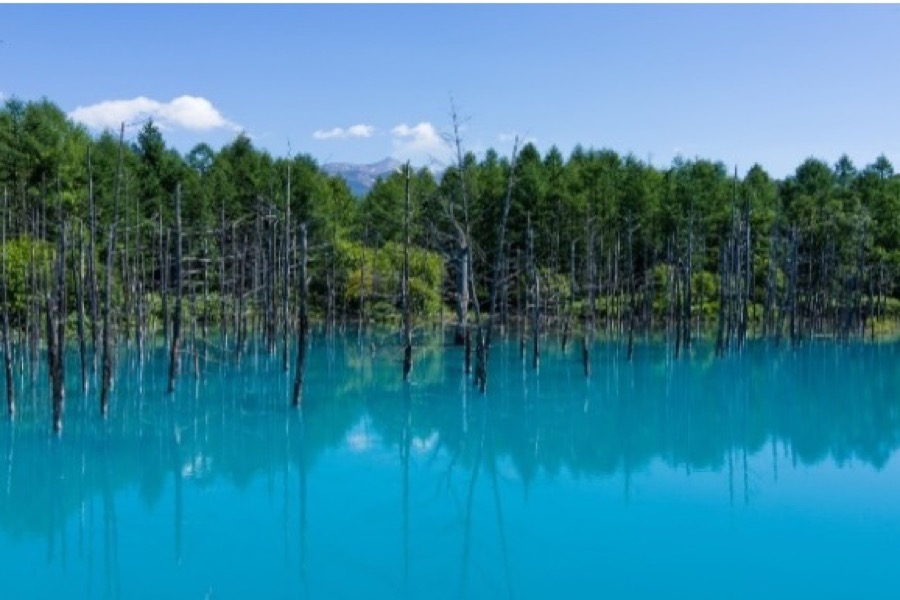 もともとは火山泥流を防ぐため建設された堰堤であったが、そこに水が溜まり偶発的に池となりました。ビエイブルーと呼ばれるこの青さの秘密は湧水や白ひげの滝などから流れる水の中にアルミニウムが含まれており、それが美瑛川の水と混ざり合い、太陽光に反射してこの神秘的な色に見えるようです。5~6月下旬頃が最も澄んだ美しいコバルトブルーが見られると言われます。百聞は一見に如かずという言葉があるように理屈はともかく、訪れたことがない方は一度行ってみてはいかがでしょうか。現地の売店で販売されている「青い池ソフトクリーム」や「青い池プリン」なども要チェックです!