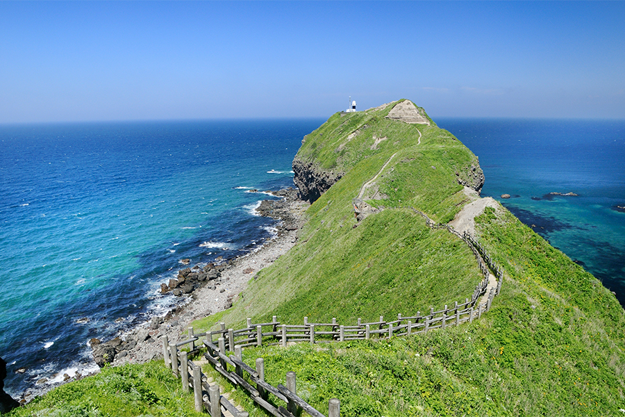 古くは女人禁制の地とされており、現在ではその歴史を表す門が1995年に設置されています。駐車場から岬の先端までは約770mの遊歩道「チャレンカの道」を歩いていきますが、周囲を見渡せば”積丹ブルー”と呼ばれる碧の海の絶景がダイナミックに広がり、最先端からは水平線の丸みや約40m沖にある「神威岩」という非常に大きく特徴的な岩礁を眺めることができます。また、ここでは記載いたしませんが神威岬は景色だけでなく、歴史や古い伝承なども多くあり、それらを知ったあとに行くとより楽しめることでしょう。