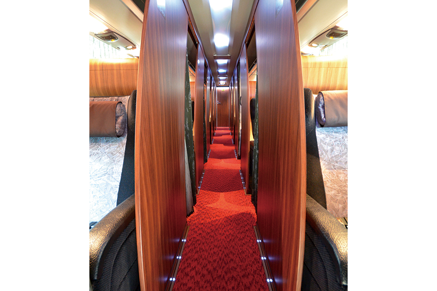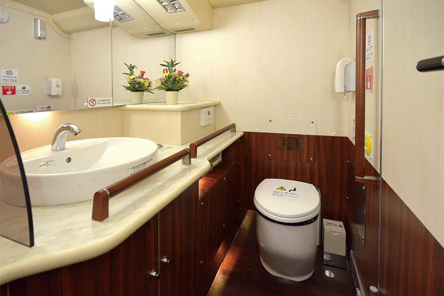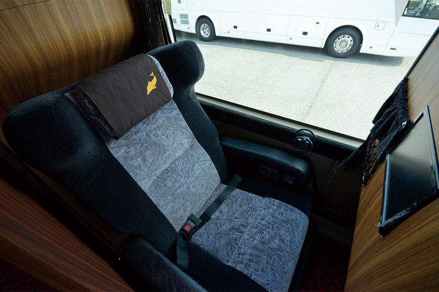 座席は2シート分を活用した広々スペース。1席ずつ独立しているので、後部座席を気にせずリクライニングし、足をゆったり伸ばしてお寛ぎいただけます。バス後方には広々とした大型化粧室があるので、長い移動も安心!