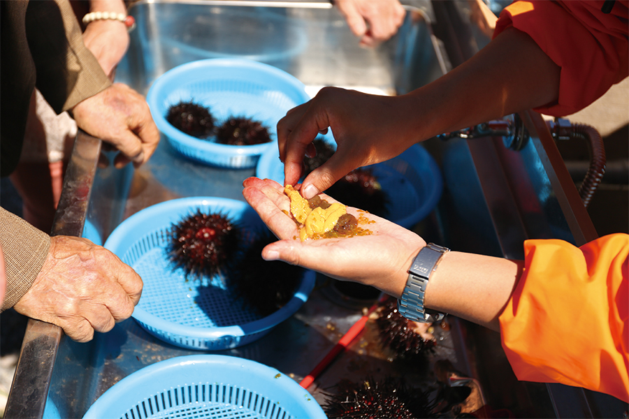 地元漁師さんと同じ方法で、うにとりにチャレンジ!自分で獲ったうにを、その場で割って食べることができます♪