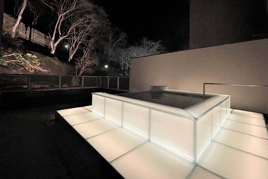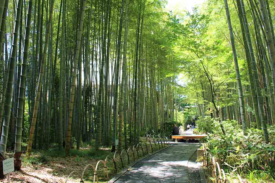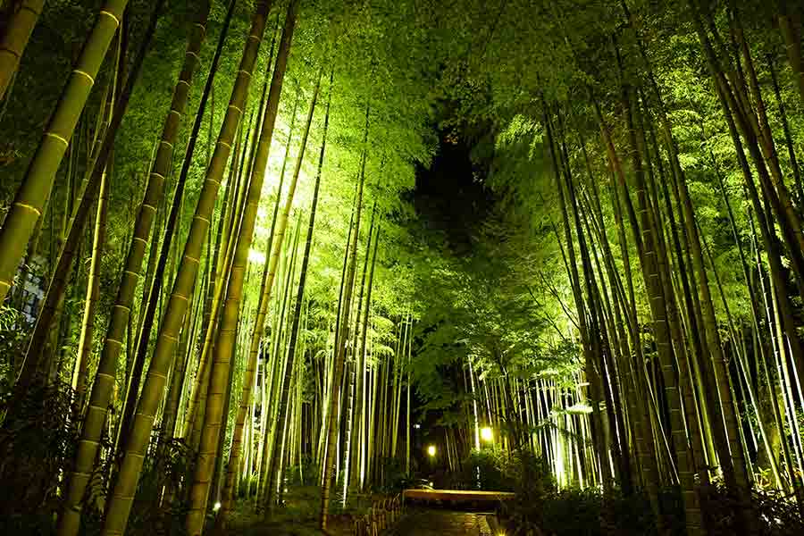 温泉街の中心部を流れる桂川に沿う遊歩道。竹林の中央では大きな竹製の円形ベンチで風を感じることができます。日没後はライトアップされ、ぐっと幻想的に!夜の散策にぴったりです♡