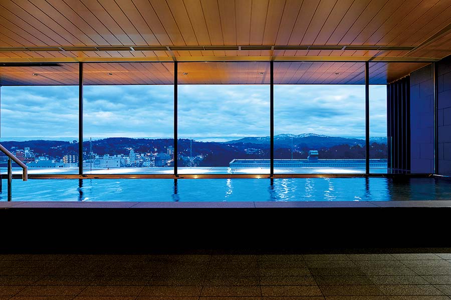 城下町を見下ろす展望風呂に浸かり、旅の疲れを癒すことができます。