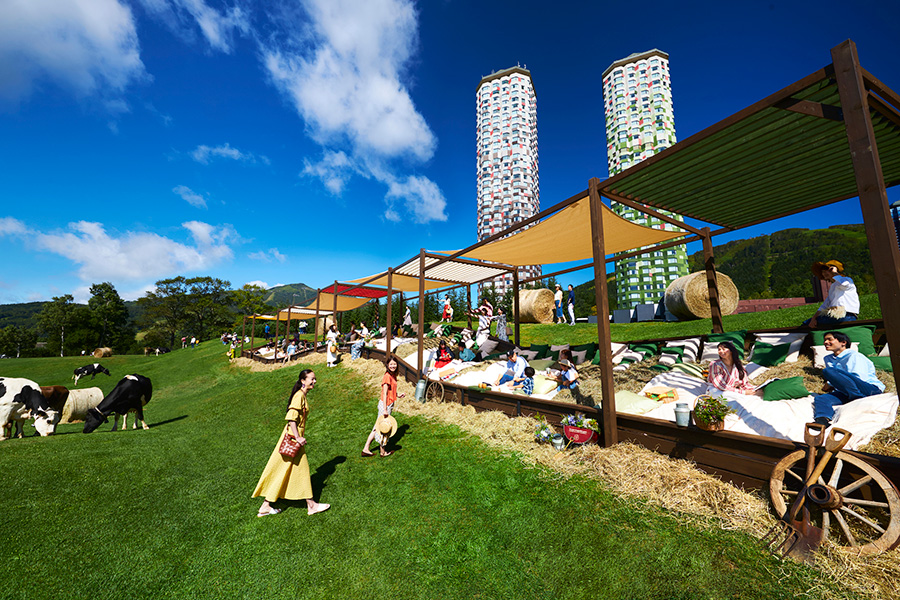 全長30メートルもあるふかふかの牧草を敷き詰めたベッドです。ゆっくり寛いでいただけるようクッションとブランケットもご用意されており、約100ヘクタールもの開放感あるファームエリアで放牧されている牛や羊などを眺めながら、のんびりとした広大な北海道らしい風景と時間を過ごすことができます。