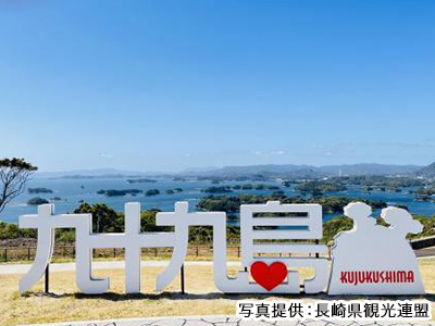 - 複雑に入り組んだリアス海岸と大小208の島々からなる風光明媚な景勝地、九十九島!2021年オープン「九十九島観光公園」の広大な芝生広場からは、これまでにない大パノラマを体感できます。可愛い文字のモニュメントは人気のフォトスポット♪