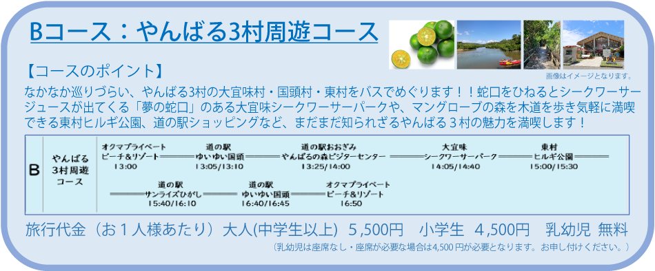 ・Bコース やんばる3村周遊コース 12:50集合/13:00出発