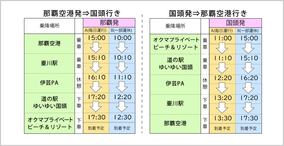 国頭エリアの乗降地は、「道の駅ゆいゆい国頭」または「オクマ プライベートビーチ&リゾート」となります。