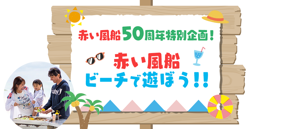 設定期間:7/16~8/27 先着500名様限定 赤い風船ビーチでご利用いただける 「ビーチセット+マリンメニュー1回+ビーチバーベキュー」がついて、 なんと!!おとな・こども(6~11才)共おひとり様1,000円でお申込みOK!!