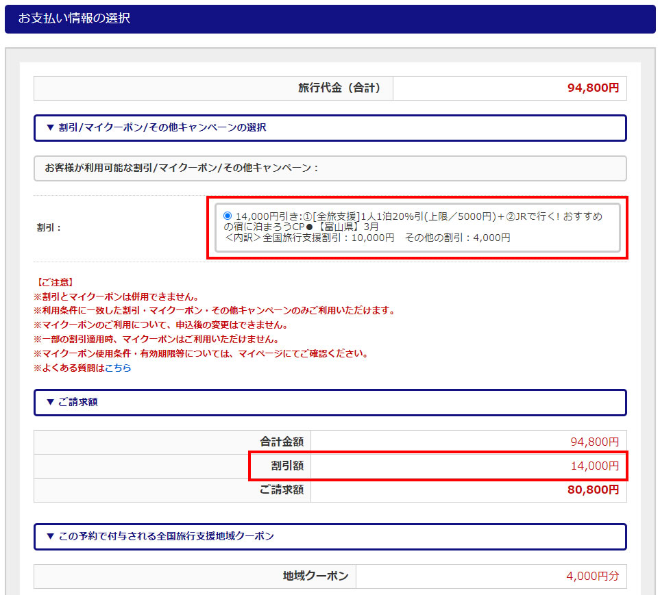 お客様支払額 | 全国旅行支援助成額 | キャンペーン割引額 |