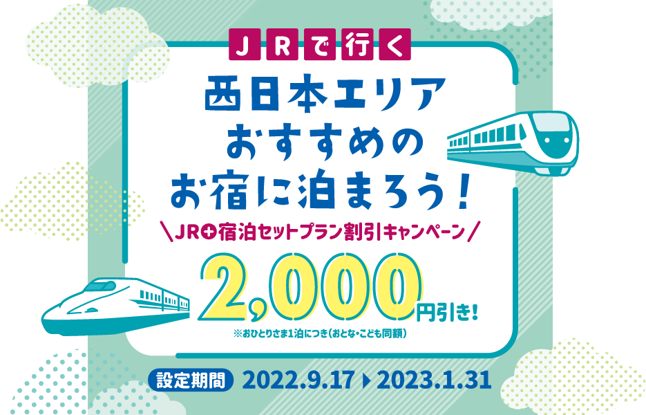 日本旅行 トップ > 赤い風船 関西版・北陸版 > JRで行く!西日本エリアおすすめのお宿に泊まろう!割引キャンペーン