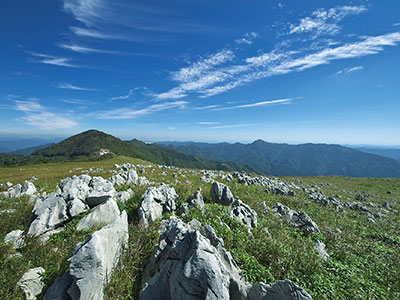 - 日本三大カルストのひとつ。その中でも最も標高の高い場所にあり、高原の雄大な景色や珍しい高原植物を楽しむことができます。白い岩肌の石灰岩、緑の草原、放牧された牛たちが織りなす牧歌的な風景は「日本のスイス」とも称され、訪れる人々を癒してくれます。