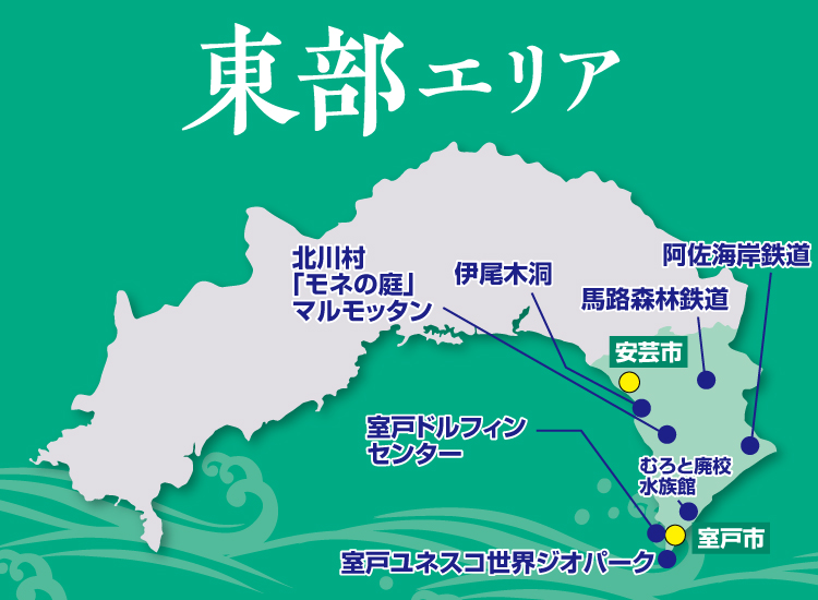 - 線路から道路へ、列車からバスへモードチェンジ!徳島県海陽町から高知県室戸市までを直通で繋ぎ、県境を跨って様々な観光スポットを巡りながら鉄道とバスの旅が楽しめます。