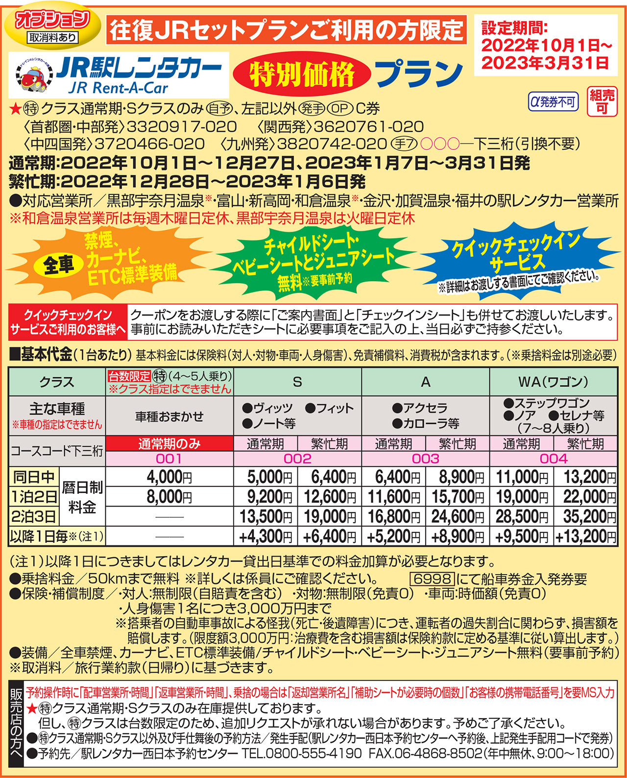 ご旅行プランお申込み完了時に、「取扱店舗への連絡事項」欄にて「北陸レンタカー」・希望の車種・利用日・利用日数・利用台数・配返車場所・時刻・チャイルドシートの有無をお知らせください。