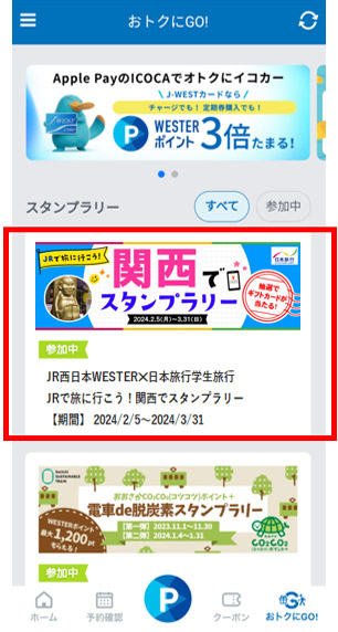 JR西日本公式移動生活ナビアプリWESTERのホーム画面にある「おトクにGO!」から「JR西日本WESTER✕日本旅行学生旅行 JRで旅に行こう!関西でスタンプラリー」ページにアクセスしよう!