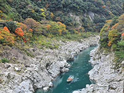 V字型に深く切り込んだ渓谷はその形から「ひの字渓谷」とも呼ばれており、秋には谷底から峰までが全山紅葉して見事です。