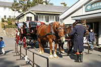 明治時代の代表的乗物である馬車に乗って、園内を回ってみよう。まさに皇族気分だ!
