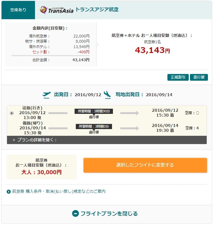 「選択したフライトに変更する」ボタンをクリックいただくと、選択中の海外航空券に選んだプランが表示されます。