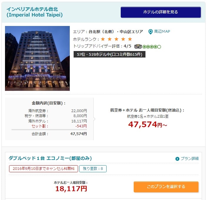 「 このプランを選択する」ボタンをクリックいただくと、選択中のホテルに選んだプランが表示されます。