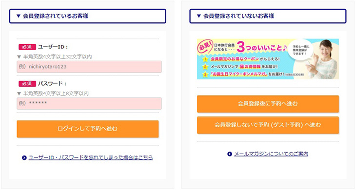 会員登録をされているお客様はユーザーIDとパスワードを入力し、「ログインして予約へ進む」ボタンをクリックしてください。