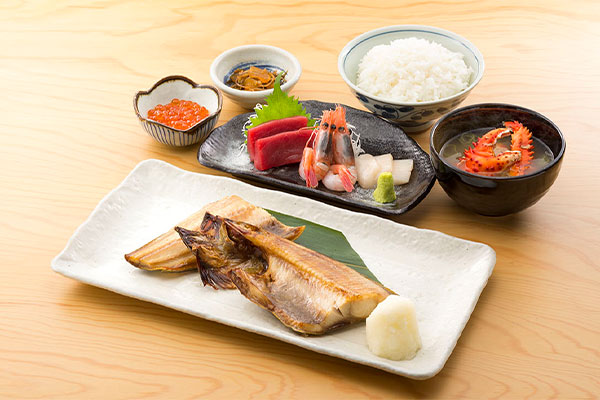 (しまほっけ・刺身・いくら醤油漬・小鉢・ご飯・かに汁)