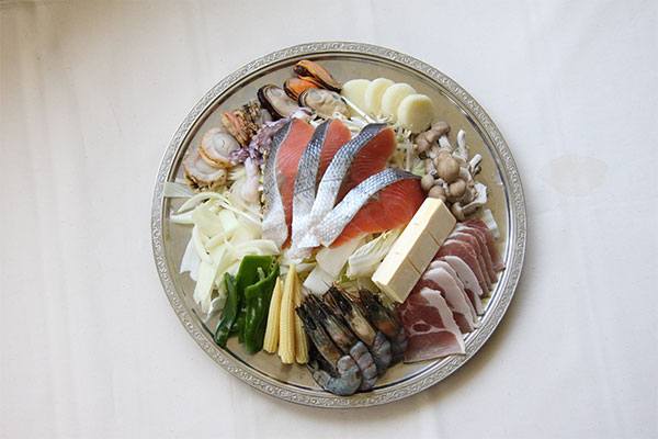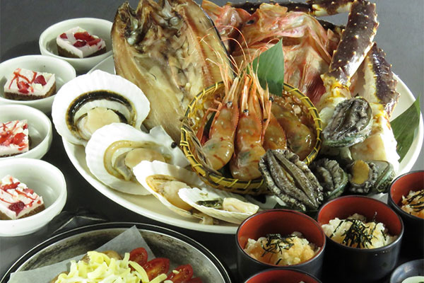 【メニュー内容】お通し、海鮮炙り焼き(帆立・ぼたんえび・かに・つぶ貝・ほっけ)、野菜の陶板チーズ焼き、ご飯、デザート