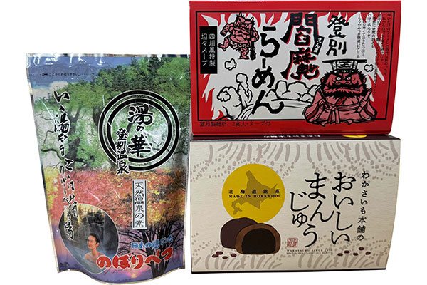 【商品内容】登別温泉天然湯の華12袋、登別閻魔ラーメン2食入、おいしいまんじゅう6個入