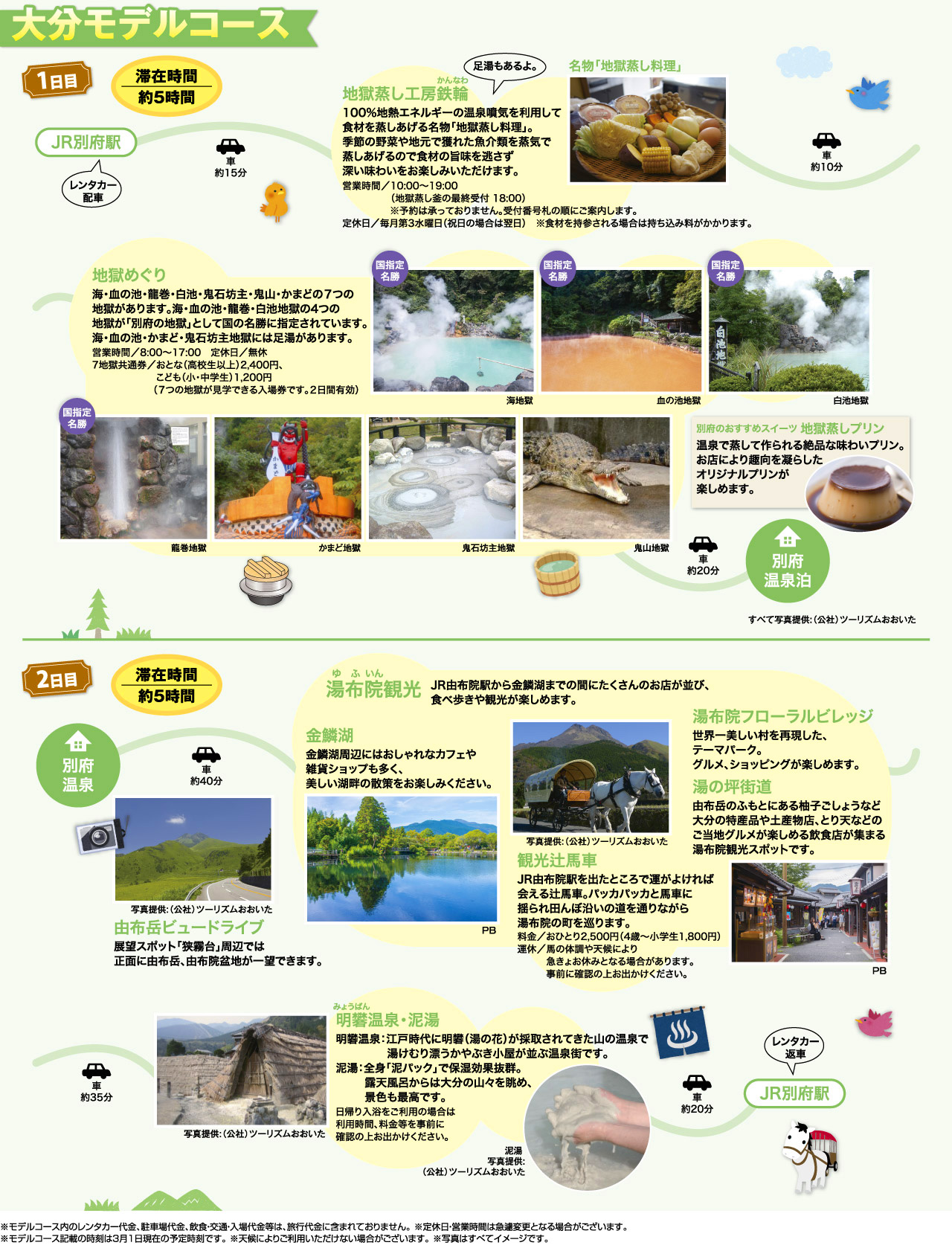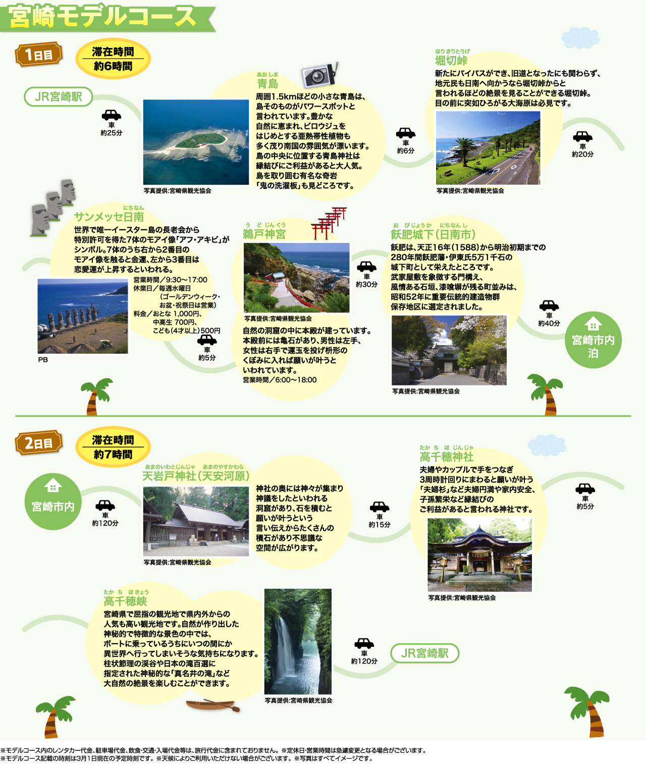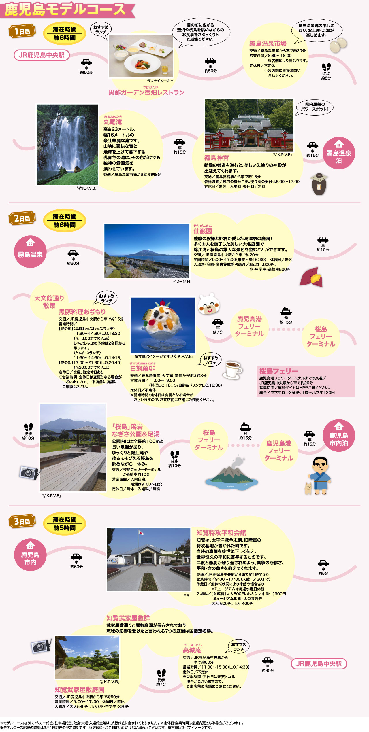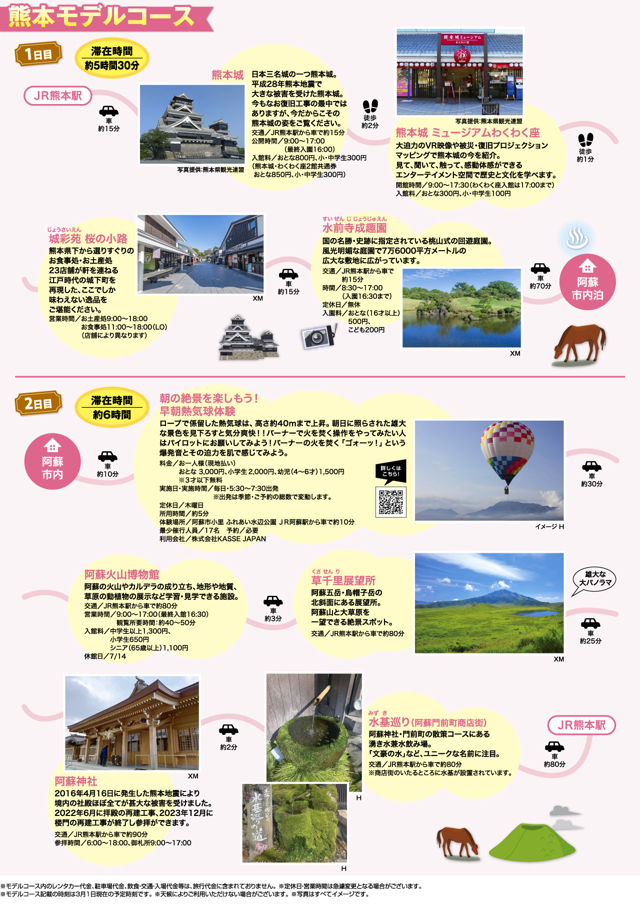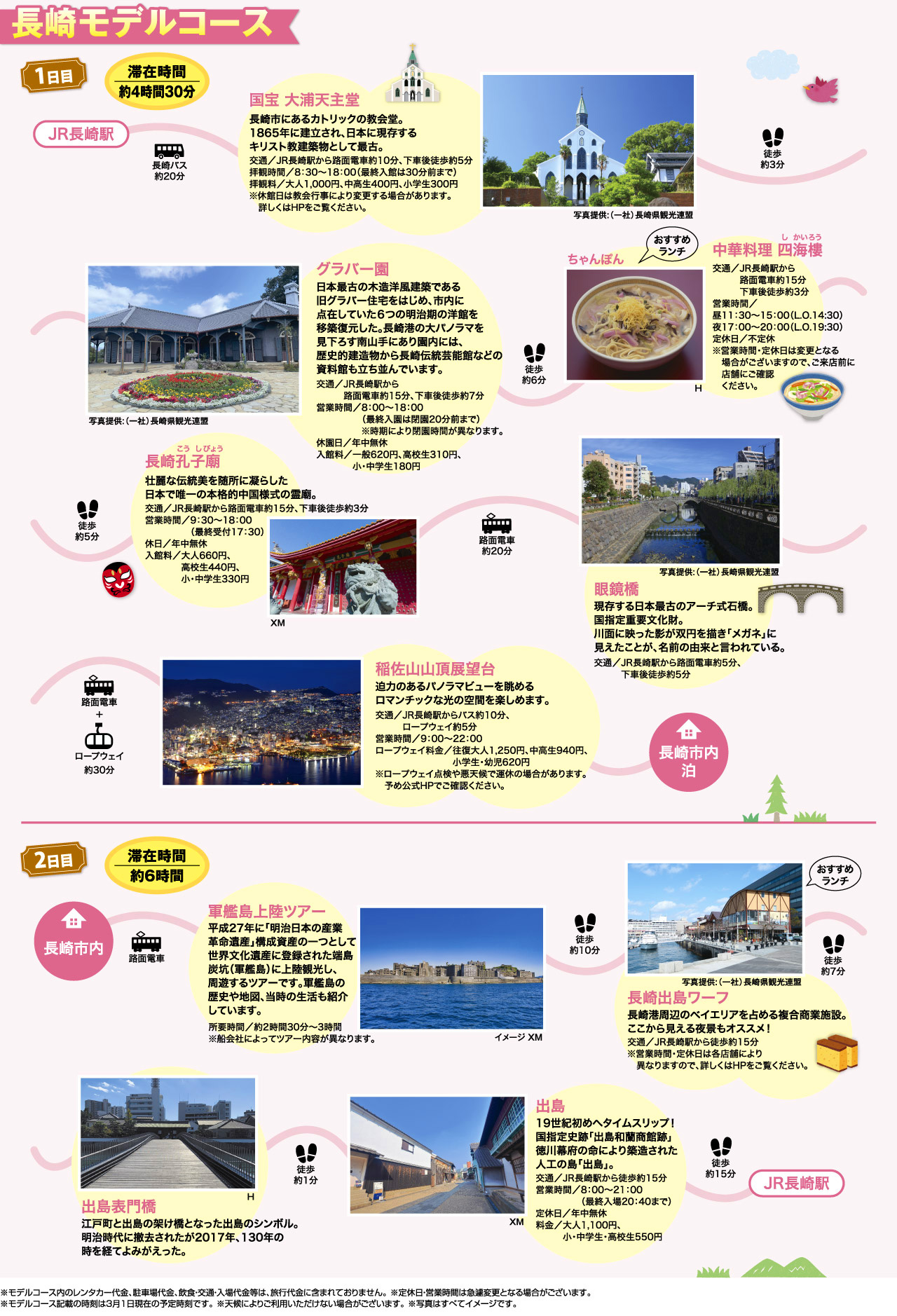 ▼ 福岡▼ 佐賀▼ 長崎▼ 熊本▼ 大分▼ 宮崎▼ 鹿児島 福岡 モデルコース 観光情報 北九州の寿司セットクーポン “すしの都 北九州”恵まれた環境で新鮮な魚が手に入るだけでなく、魚の締め方などにも特徴があり、お客様の口に入る時間を計算し、魚に神経締めを施す卸業者もいるほど。是非、北九州にお立ち寄りの際は北九州のお寿司をお楽しみください。 詳しくはこちら 営業時間店舗により異なります。 定休日店舗により異なります。 料金3,800円 セット内容寿司8~12種類程度・汁物※店舗や季節、仕入れ状況によりネタ、貫数などは変更となる場合がございます。 お申込みこちらからお申込みください。https://app.kitakyushu-sushi.com/product/3800/ 福岡(天神・博多)のおすすめ屋台の食べ歩きチケット「屋台きっぷ」 福岡(天神・博多)のおすすめ屋台の食べ歩きを楽しめるチケットです。チケット1枚でドリンク1杯+屋台おすすめメニューを楽しめます。提携の屋台12軒で使えるので、どこに行ったらいいかわからない、値段がわからない、などの不安を解消します! 詳しくはこちら 住所〒812-0012 福岡市博多区博多駅中央街1-1 営業時間8:00~19:00/福岡市観光案内所(博多駅総合案内所) 定休日店舗により異なる 料金1枚:1,100円 アクセスJR博多駅構内 問合せ092-431-3003 観光情報に記載の施設の体験・入場券等は、現地にてお買い求めください。 佐賀 モデルコース 観光情報 湯遊嬉野チケット 日本三大美肌の湯と称される嬉野温泉。10以上の施設でお得に嬉野温泉を堪能できます♪16枚綴りのチケットを使って、お好みの温泉に入浴することができます。 詳しくはこちら 住所〒843-0301 佐賀県嬉野市嬉野町大字下宿乙2202-55 引換時間・場所9:00~18:00/嬉野温泉観光協会案内所 定休日各施設により異なります。 ※木曜日は観光案内所定休日のため、チケットの引き換えができません。 料金2,200円/16枚綴り アクセス嬉野インターより車で約5分 問合せ0954-43-0137 有田焼トレジャーハンティング 有田焼の器が新旧10万点以上眠る広い倉庫からカゴいっぱいに器を集めて持ち帰れます。雰囲気たっぷりの窯元の蔵で、お気に入りの器を見つけましょう! 詳しくはこちら 住所〒844-0023 佐賀県西松浦軍有田町丸尾丙2512 営業時間10:00~12:00/13:00~15:00 ※12:00~13:00は受付休止中 定休日不定休 料金6,600円 アクセスJR有田駅から車で約5分 問合せ0955-42-4121 観光情報に記載の施設の体験・入場券等は、現地にてお買い求めください。 長崎 モデルコース 観光情報 長崎ストーリーズ 様々な文化の影響を受け、ユニークな歴史を持つ異国情緒漂う長崎で定番観光施設から隠れ家的スポットまで、ガイドと一緒にまち歩きを楽しみませんか?それぞれのストーリーに触れることで、「もっと長崎を知りたい」「もっと長崎を歩いてみたい」そして「もっと長崎を訪問したくなる」そんな2時間のまち歩きをお届けします。 詳しくはこちら 住所コースにより異なる 営業時間10:00~、14:00~ 定休日なし 料金1名1,900円~※コースにより異なる アクセスコースにより異なる(JR長崎駅から各所30分以内) 問合せ095-818-3430((一社)長崎国際観光コンベンション協会 SASEBOナイトツアー 地元ガイドが一緒で安心!ディープな佐世保の夜を体感できます。JAZZバーや外国人バーを現地ガイドがご案内。アメリカンな佐世保の夜を体験します。 詳しくはこちら 住所〒857-0863 長崎県佐世保市三浦町21-1 集合時間・場所19:30/MR松浦鉄道 佐世保中央駅前 営業日時毎週金曜日・土曜日・祝前日/19:30~20:30 定休日年末年始(12/27~1/5) 料金3,000円(1ドリンク付) アクセスJR佐世保駅構内 問合せ0956-22-6630/佐世保観光情報センター(営業時間9:00~18:00)7日前までにご予約ください。 観光情報に記載の施設の体験・入場券等は、現地にてお買い求めください。 熊本 モデルコース 観光情報 球磨川下り<清流コース> 最上川・富士川と並ぶ日本三大急流の一つでもある球磨川ですが、比較的穏やかな区間を木舟に乗り熟練船頭のガイダンスを楽しみながら、四季折々の景観と鳥のさえずりに耳を傾け大自然を楽しむ約50分のコースです。 詳しくはこちら 住所〒868-0033 熊本県人吉市下新町333-1 営業時間11:00~、13:00~、15:00~ 定休日水曜日※定休日は変更になることがあります。 料金おとな:3,500円、こども(小学生):2,100円、幼児(3才~):1,500円 アクセスJR新八代駅から車で約40分 問合せ0966-22-5555(現地へ事前に予約をお勧めいたします) 天草イルカウォッチング(シークルーズ) 天草に生息する野生のミナミハントウイルカを見に行こう!ミナミハントウイルカは大変人懐っこく、クルーザーと並んで泳いだり、目の前でジャンプしたり、魚をくわえて出てきたりと様々なパフォーマンスを見せてくれます。また、天草五橋や有明海、島々を巡る爽快なクルーズも楽しむことができます。 詳しくはこちら 住所〒861-6195 熊本県上天草市松島町合津6215-17 営業時間10:00~、13:00~、15:00~ ※最短1時間~最長2時間 定休日不定休 料金おとな:5,500円、中学生:4,500円、小学生:3,500円、幼児(3歳