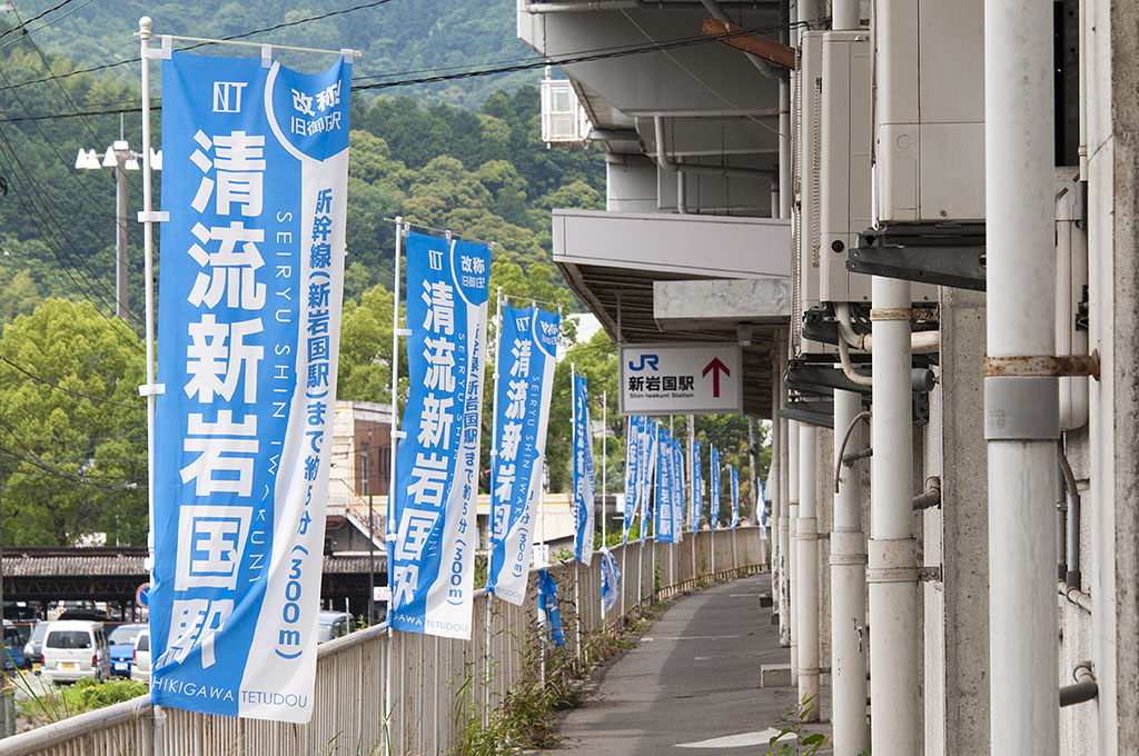 と書いた幟がズラッとはためいています。これだけ並べられると、迷う心配もなく歩けます。300mですから、歩くのにさほど抵抗はないですよね。新岩国駅に着けば、広島はもちろんのこと、東京・大阪・博多などへも行けますから、帰路にピッタリのコースでしょう。もし時間があるなら、新岩国駅前から錦帯橋経由岩国駅行の路線バスが出ていますので、錦帯橋見学をすることもできます。