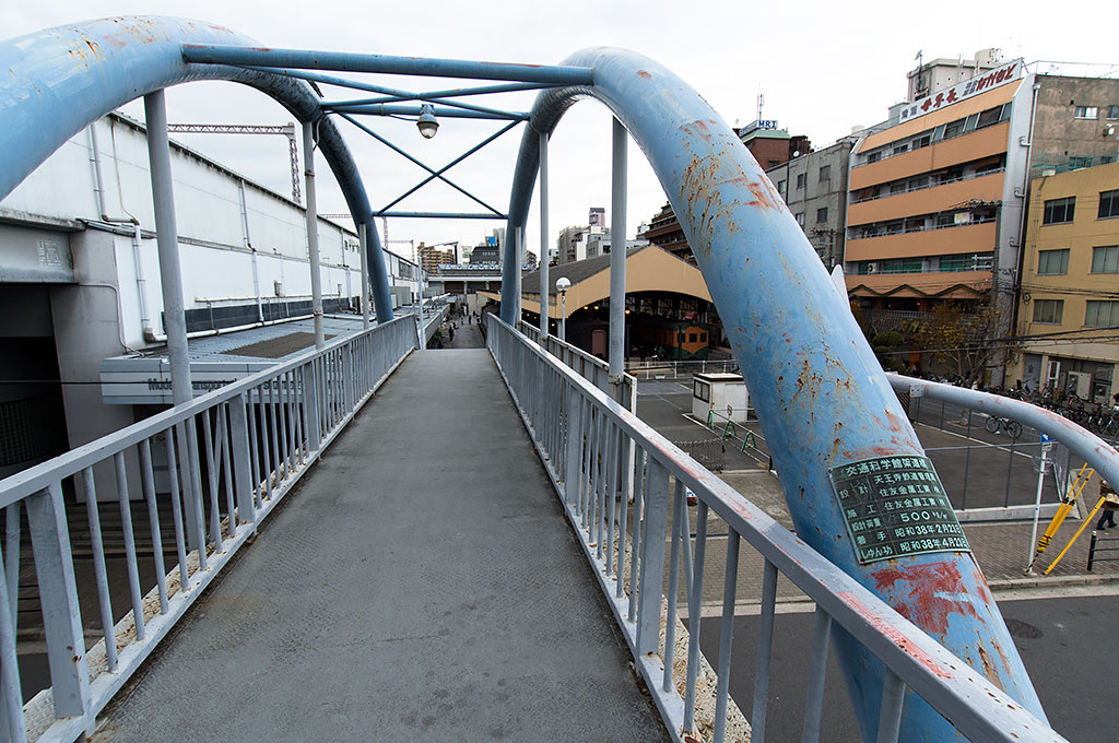 銘板には、設計が天王寺鉄道管理局と住友金属工業であり、昭和38年4月23日に竣工と記されています。交通科学博物館の開業は前述のとおり1962(昭和37)年ですが、これは大阪環状線の開通記念事業の一環でした。その開館の翌年にこの跨線橋が国鉄天王寺鉄道管理局によって架けられていることがわかります。