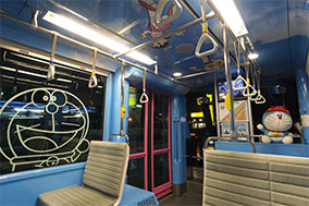 同じく天井に描かれている「ドラえもん」登場者たちも見やすいですし、運転席横に陣取っている「ドラえもん」のぬいぐるみも、背後が暗くなっているので、昼間より存在感が増す感じです。