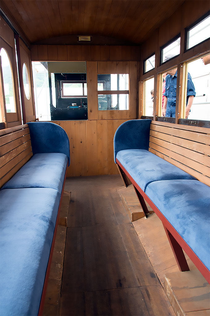 これほど狭い車両なので、椅子の背にはモケットが貼られていませんし、椅子の下は走行用の台車の枠や車輪を避けるために、凸凹になっています。設計時の苦労が忍ばれますよね。