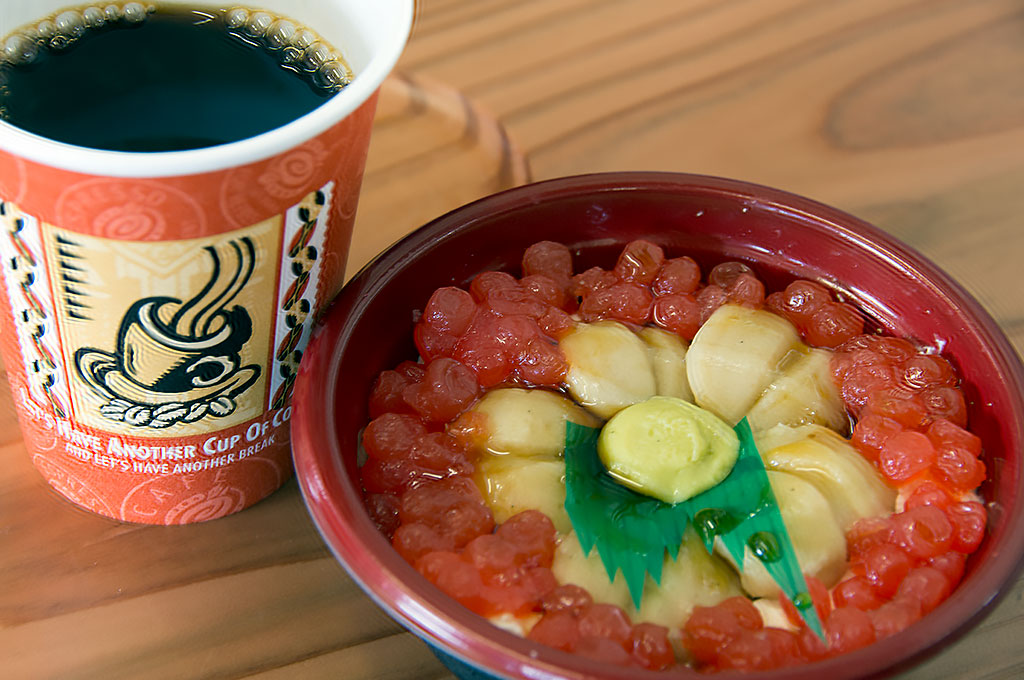 中央の“うに”は栗のクリーム、周囲の“いくら”はグレナデン風味のオレンジゼリー、“しょうゆ”はカラメルソースで、“わさび”はピスタチオクリーム、“ごはん”はスポンジケーキといった具合です。函館のスイーツの名店「プティ・メルヴィーユ」製で、温かいコーヒーとセットになっています。
