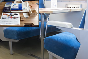 前回記したとおり、「ながまれ号」はふだん他の車両に混じって定期列車として運転されています。「ながまれ海峡号」として走るときは、飲食をし易いように車庫でテーブルが設置されます。よく見ると、シートの間に組み立て式のテーブルをつけて、窓側のくぼみと床で固定するようにしてあります。一見やや頼りない感じがしないでもないですが、実際に使ってみるとしっかりとしていて、足を置く空間にも配慮されているなかなか見事な造りです。