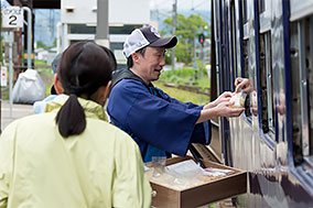 かつての駅弁と同じく窓越しに買う人、ホームに出て箱の中身を吟味しながら買う人などなど、みなさん何を買おうかと真剣な顔つきながらも楽しそうです。わずか10分の停車時間ですが、ちょっと緊張気味だった車内が、上磯駅停車中になごやかになりました。
