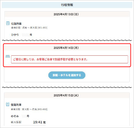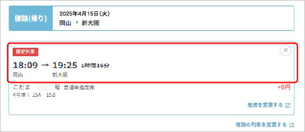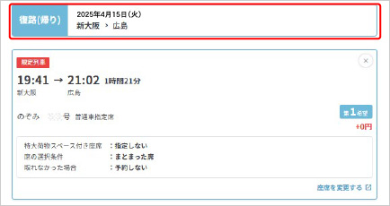 - 「プラス1TRIP」利用列車の大阪(または新大阪)駅着時間をご確認の上、「大阪旅行」の復路(帰り)JR列車をご予約ください。